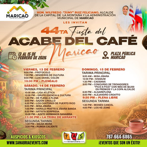 El Municipio de Maricao junto a su alcalde, el Honorable Wilfredo “Juny” Ruiz, invitan a todo el pueblo de Puerto Rico a disfrutar de la 44ta. edición de la tradicional Fiesta del Acabe del Café, a celebrarse desde el viernes, 13 hasta el domingo, 15 de febrero de 2026, en la Plaza Pública de Maricao.